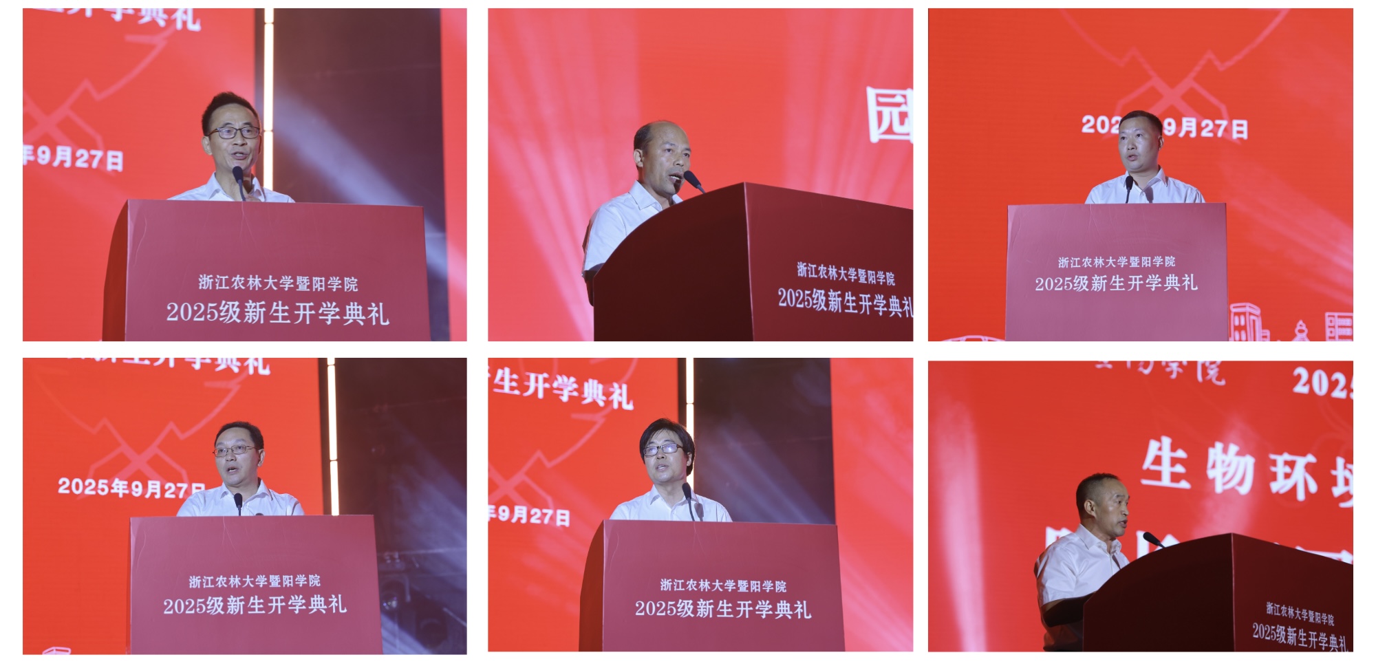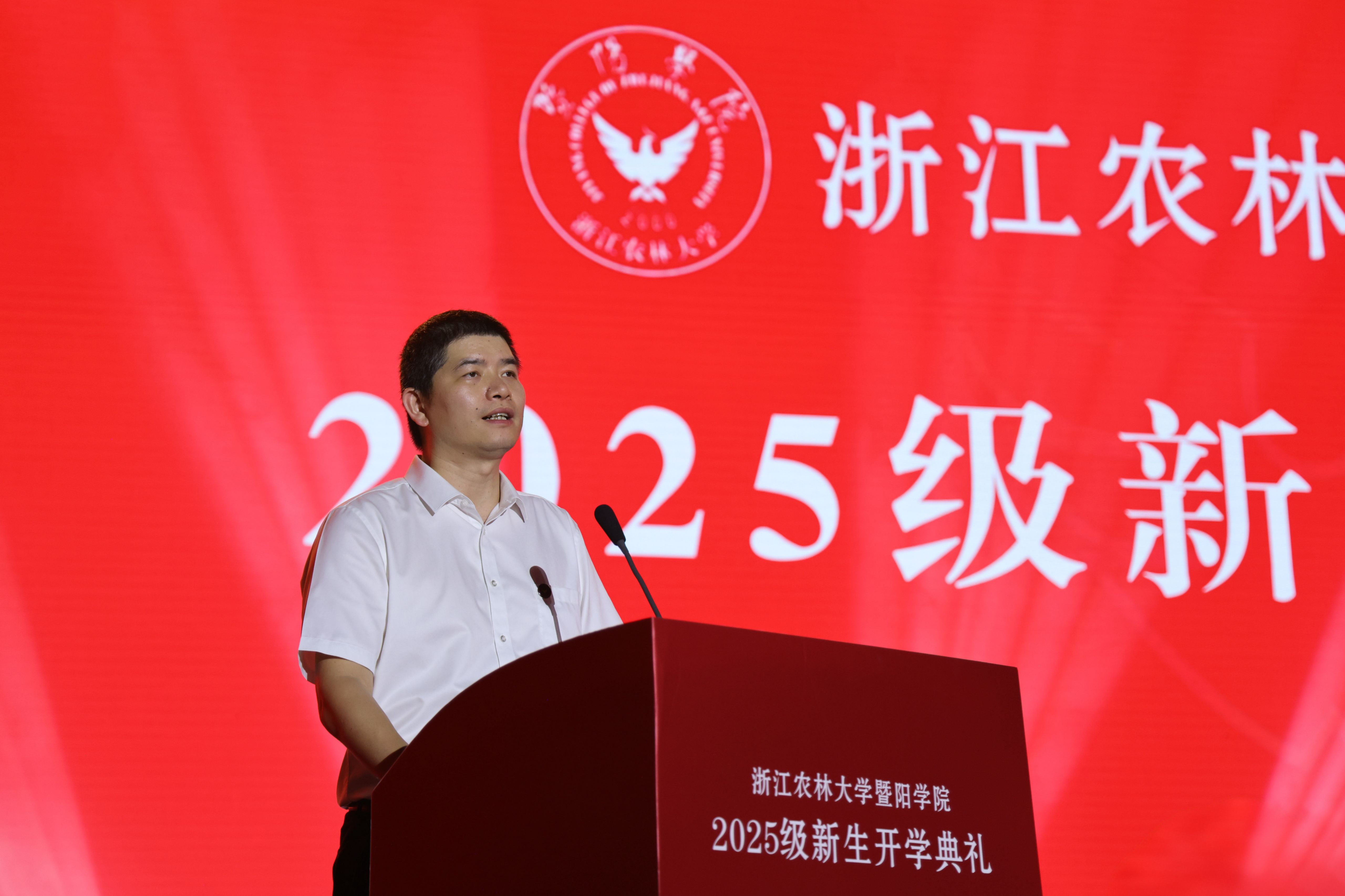 山河辞暑,梧叶知秋。9月27日晚,浙江农林大学暨阳学院2025级新生开学典礼在篮球馆举行。浙江农林大学党委书记朱斌、副校长徐爱俊,诸暨市人民政府副市长童云英,学院党政班子全体成员出席典礼。典礼由学院党委副书记张付安主持。