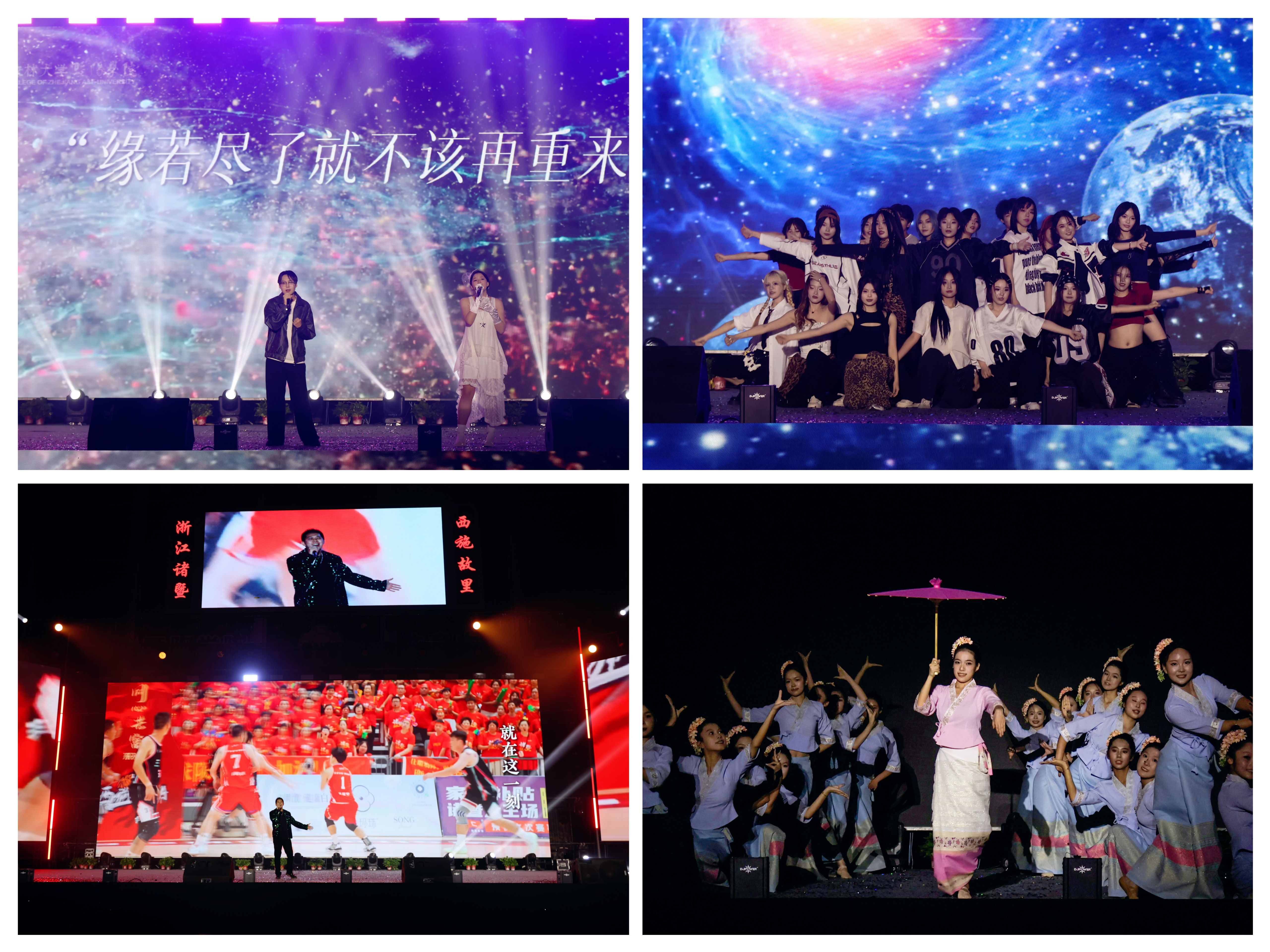 音乐类节目中,《追梦赤子心》《山河》等曲目旋律悠扬动人,不仅唤醒了现场观众的情感共鸣,更以激昂的曲调唱响了新时代青年的理想与担当,拉开青春序曲的精彩篇章;舞蹈类节目同样看点十足,《Fighting》《舞动青春》两支舞蹈以强劲的节奏、利落的动作和饱满的热情,将青年群体的蓬勃朝气与昂扬姿态展现得淋漓尽致,每一个舞姿都传递着青春的无限活力。原创舞台剧《珍珠保卫战》成为晚会的一大 “文化亮点”。作品深度结合诸暨地方特色产业和我院人工智能产业学院运行现状,从产创融合的角度生动演绎了一支团队在创新创业过程中的历程,既展现了浓郁的地域特色,也为整场晚会注入了独特的文化内涵,赢得现场阵阵掌声。随后登场的诸暨特别节目《就在这一刻》,凭借贴近本土的情感表达、极具感染力的舞台呈现,成功点燃全场观众的热情,将晚会氛围推向高潮。