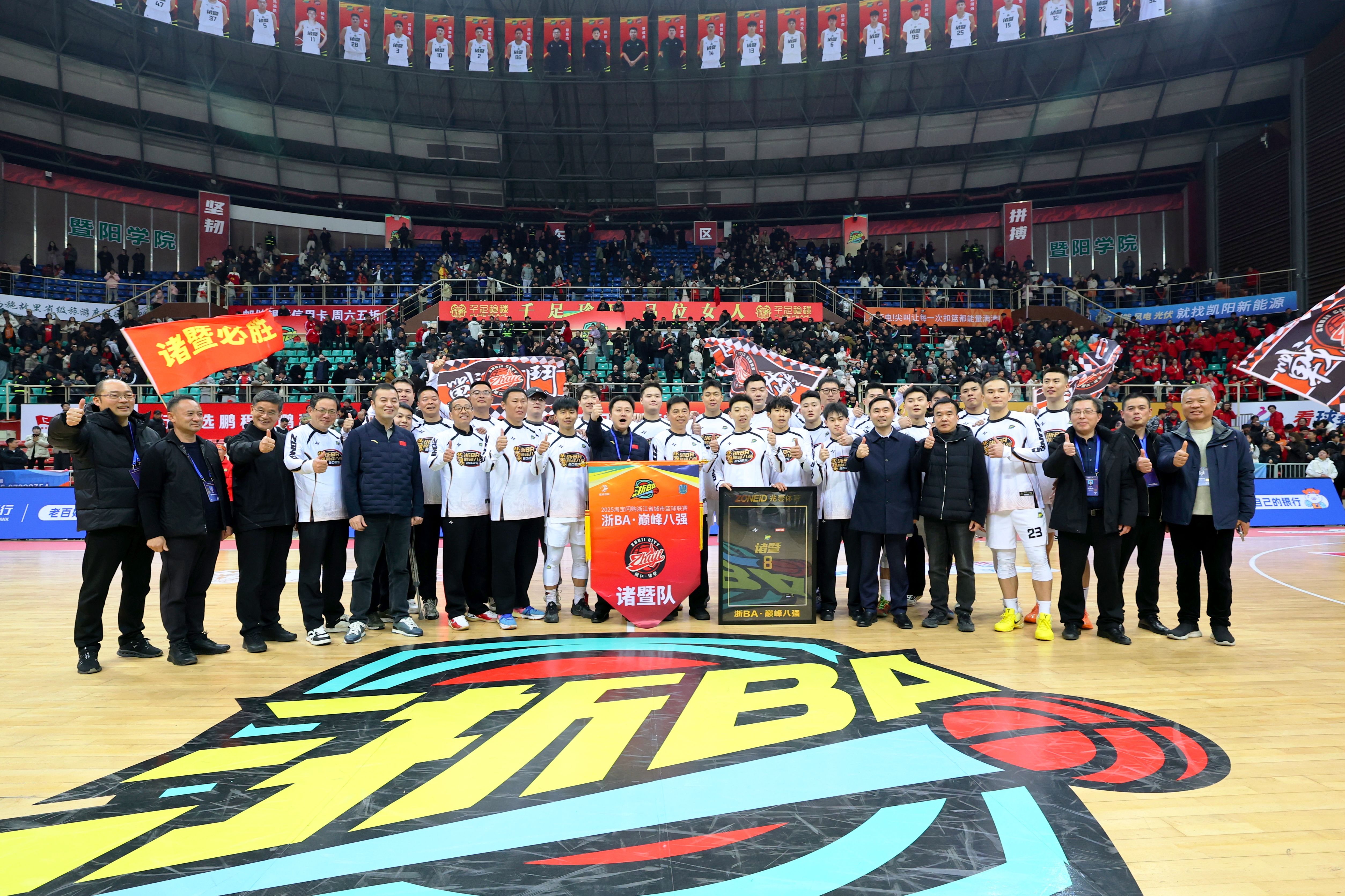 本场比赛不仅是排名争夺的关键战,更是两支劲旅的荣誉战。整场比赛悬念迭起,对抗激烈。诸暨队上半场先发制人建立优势,下半场面对反扑顽强坚守,最终在加时赛中以86比84险胜对手,凭借这场硬仗成功锁定八强席位。赛后现场举行了“浙BA•巅峰八强”晋级仪式,诸暨市委书记金进富为球队授巅峰八强专属荣耀战袍和晋级旗帜。至此,本届“浙BA”城市争霸赛诸暨主场的全部赛程也圆满落下帷幕。