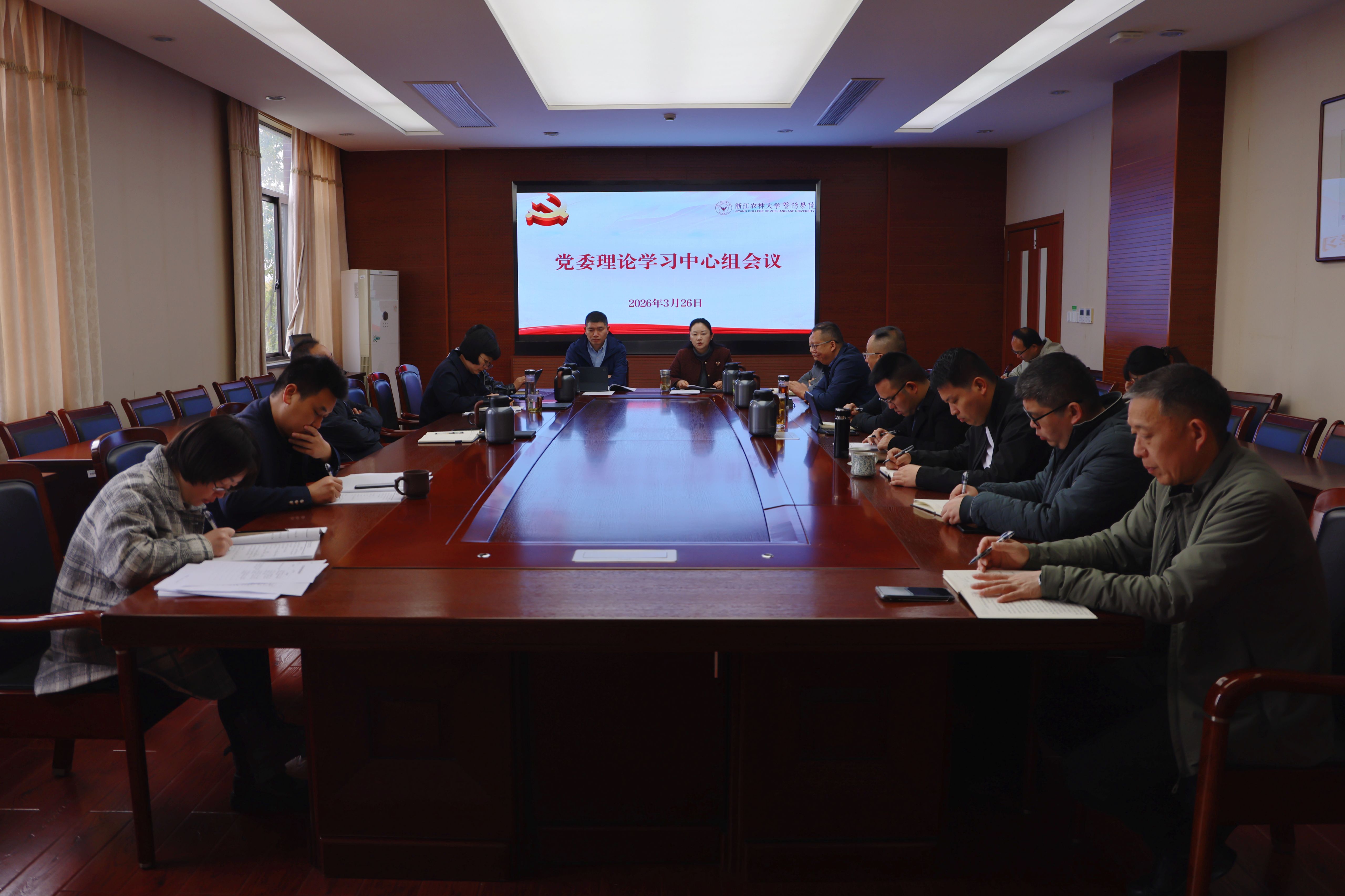 3月26日上午,学院召开党委理论学习中心组会议,深入学习贯彻习近平总书记关于树立和践行正确政绩观的重要论述,专题学习2026年全国两会精神、《中国共产党思想政治工作条例》以及“与时俱进的浙江精神”。学院党委书记洪昀主持会议。