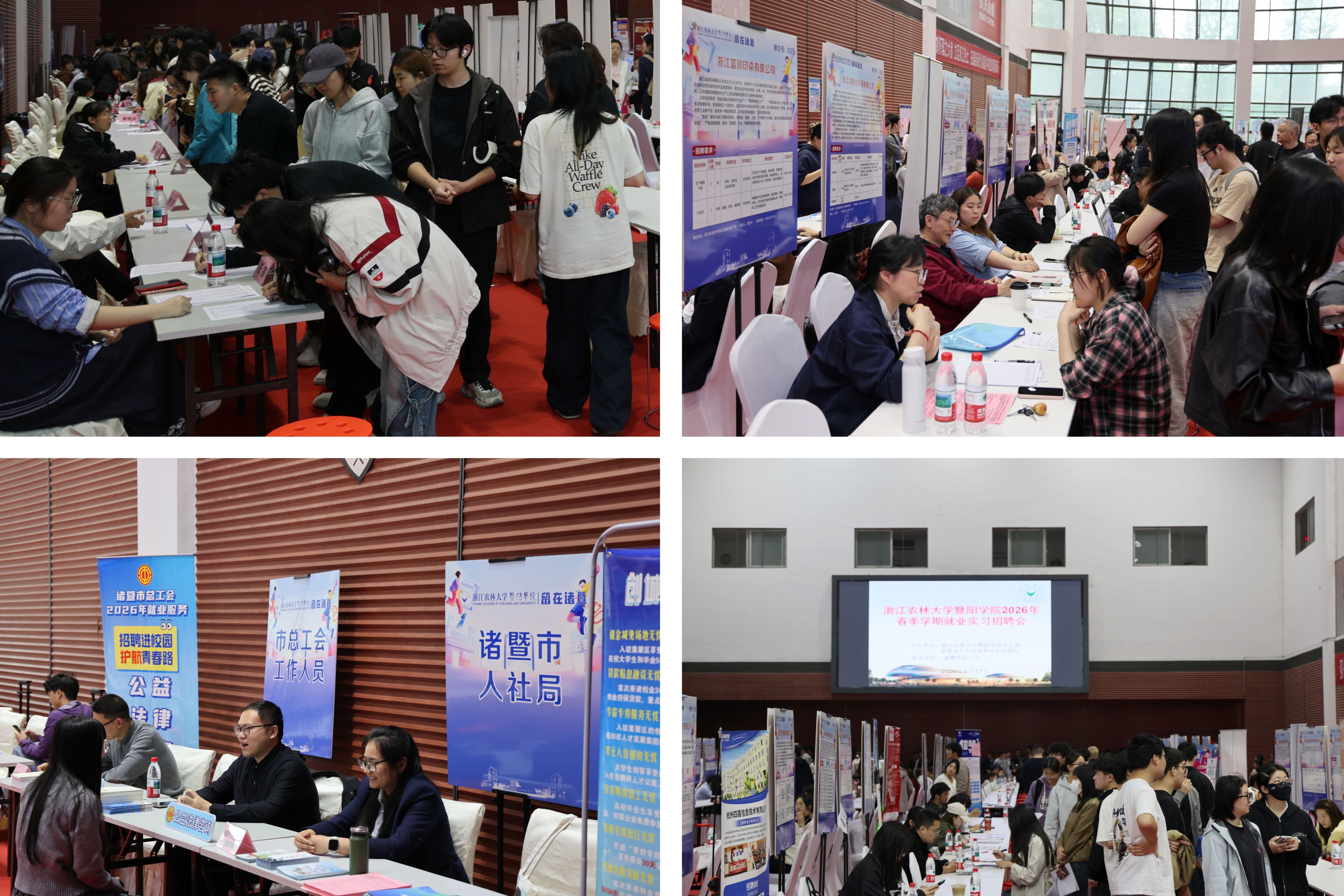 各二级学院学生工作负责人及2026届、2027届毕业班辅导员全程驻点招聘会现场,为毕业生提供简历优化、岗位推荐、面试技巧提升等一站式就业指导服务。诸暨人社局、诸暨市总工会在现场设立政策咨询服务台,面向毕业生开展留诸就业创业政策解读、就业签约法律维权等现场咨询服务。
