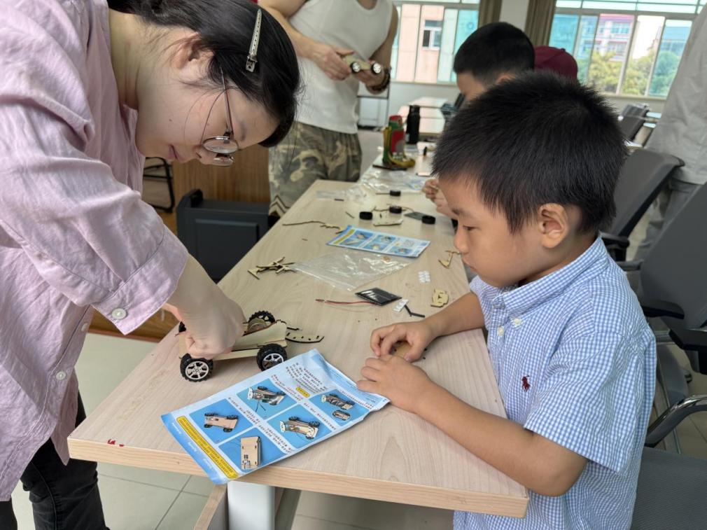 课堂上,学生党员采用“理论+实践”的教学模式,先通过视频短片和简易实验,让孩子们直观理解“太阳能如何通过光伏板转化为电能”。随后,学生党员们分组指导小朋友进行“太阳能小车”的组装,从光伏板的线路连接、车轮轴的精准对接,到电池盒的固定与电机调试,每一个步骤都细致讲解,让孩子们知道其中的科学逻辑,并手把手纠正组装偏差,鼓励孩子们自主发现问题、尝试解决问题。