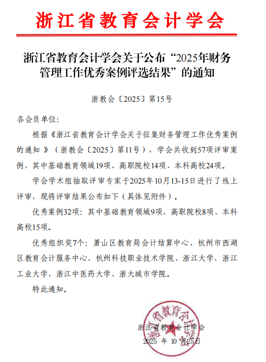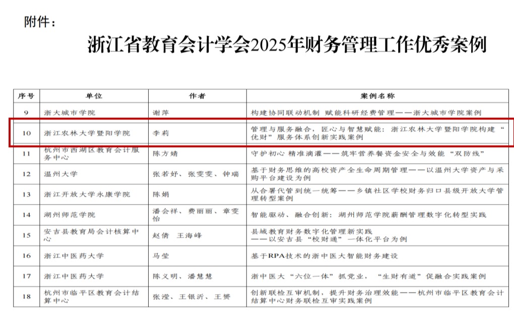 10月30日,2025浙江省教育会计学会第七次会员代表大会第七届第一次理事会在杭州举行,学院计划财务部受邀参会并获表彰。由计划财务部选送的案例《管理与服务融合,匠心与智慧赋能:浙江农林大学暨阳学院构建“优财”服务体系创新实践案例》经评审,成功入选优秀案例。该成果标志着学院在推进财务管理与服务创新方面取得了新突破。
