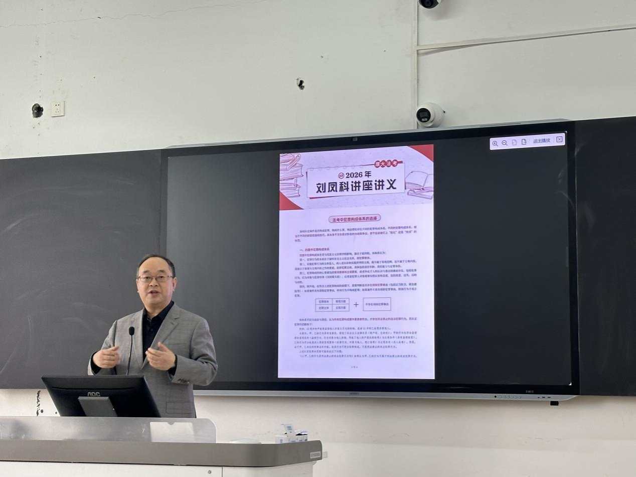 12月30日,人文学院、马克思主义学院在人文1513教室举办法考备考专题讲座。本次讲座邀请厚大法考讲师、北京工商大学副教授刘凤科担任主讲,主题为“马工程教材规范下如何备战2026年法考刑法”。法学专业本科生参加讲座。