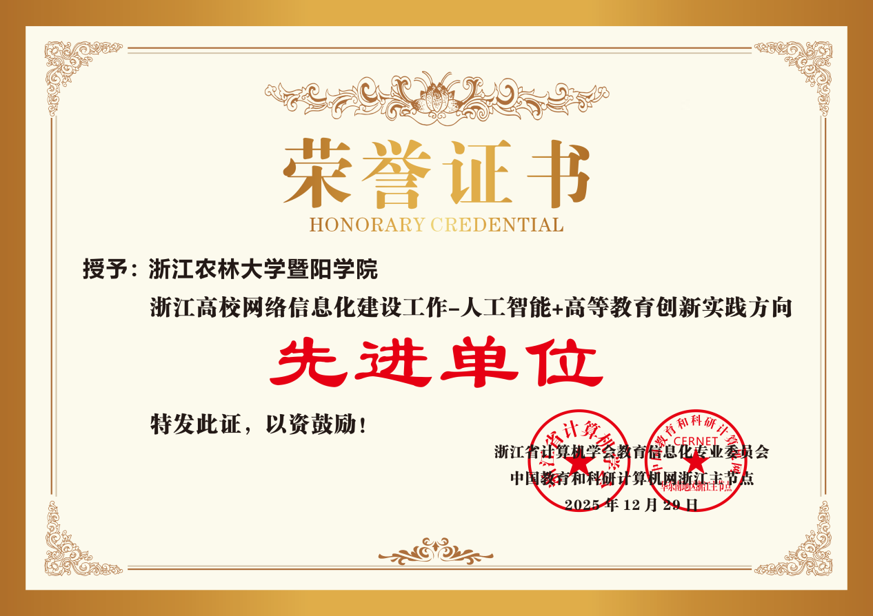 1月4日,学院正式收悉2025年度浙江省高校网络信息化建设先进单位的荣誉证书。在此次由浙江省计算机学会教育信息化专业委员会与中国教育和科研计算机网浙江主节点联合主办的评选中,学院获评“浙江高校网络信息化建设工作——人工智能+高等教育创新实践方向”荣誉称号。同时,信息与教育技术中心教师黄剑波凭借出色的工作表现与专业能力,获评“浙江高校网络信息化建设先进个人”。