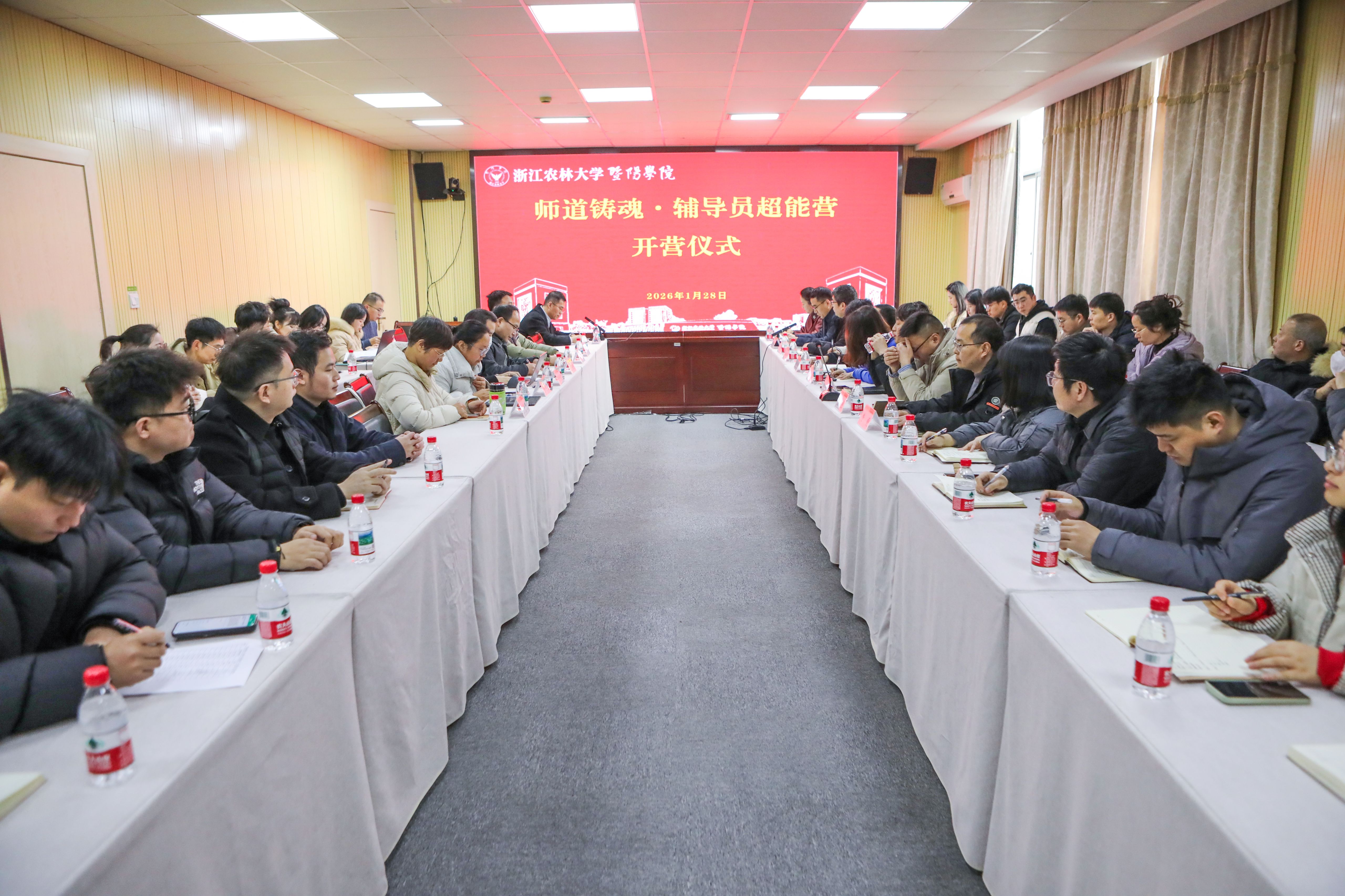 为深入贯彻落实立德树人根本任务,扎实推进辅导员队伍专业化、职业化建设,1月28日,学院“师道铸魂·辅导员超能营”开营仪式在行政楼206会议室举行。学院党委书记洪昀,宣传部、学工部、安保部负责人,二级学院党总支负责人及全体辅导员参加会议。会议由党委副书记张付安主持。