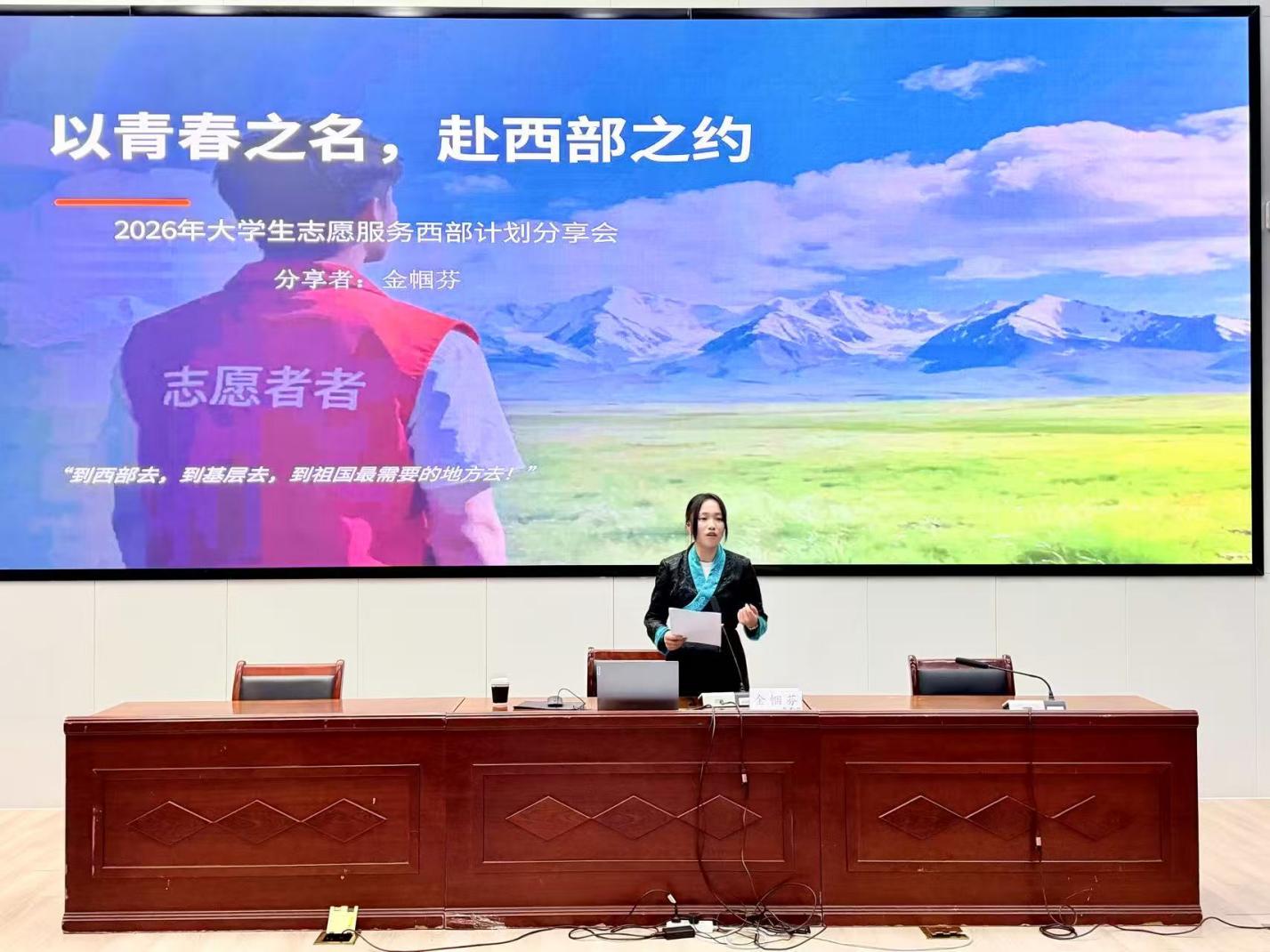 分享会上,金帼芬以“用一年不长的时间,做一件终身难忘的事”为主题,结合自身在西藏那曲市嘉黎县融媒体中心的志愿服务经历,为同学们带来了一堂兼具责任担当与职业规划的生动课程。她细致解读了西部计划的报名政策、岗位设置及发展保障,并结合艺术专业特色,分享了基层一线的职业成长路径——用镜头定格乡村发展变迁,以设计助力地方文化传播,让专业本领在服务国家重大战略中实现价值、绽放光彩。