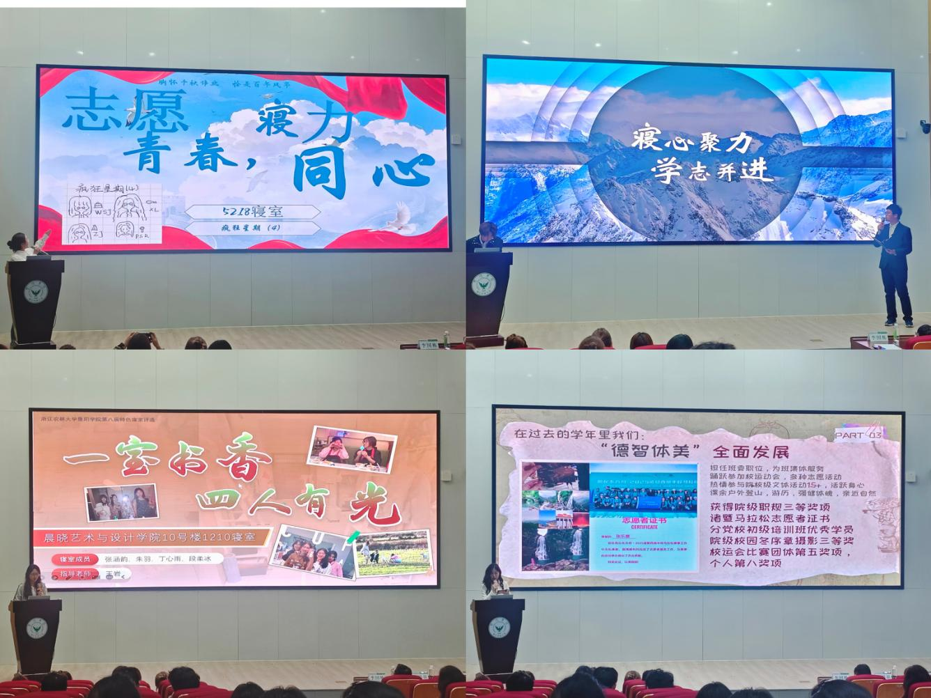 本次评选共有12间寝室进入决赛。各寝室通过ppt、创意视频和实景照片展示的方式,将宿舍里的整洁环境与文明寝室建设的特色布置一一呈现,用多样的形式勾勒出独属于暨阳学子的宿舍生活图景,展现了青年学子昂扬向上、文明自律的精神风貌。