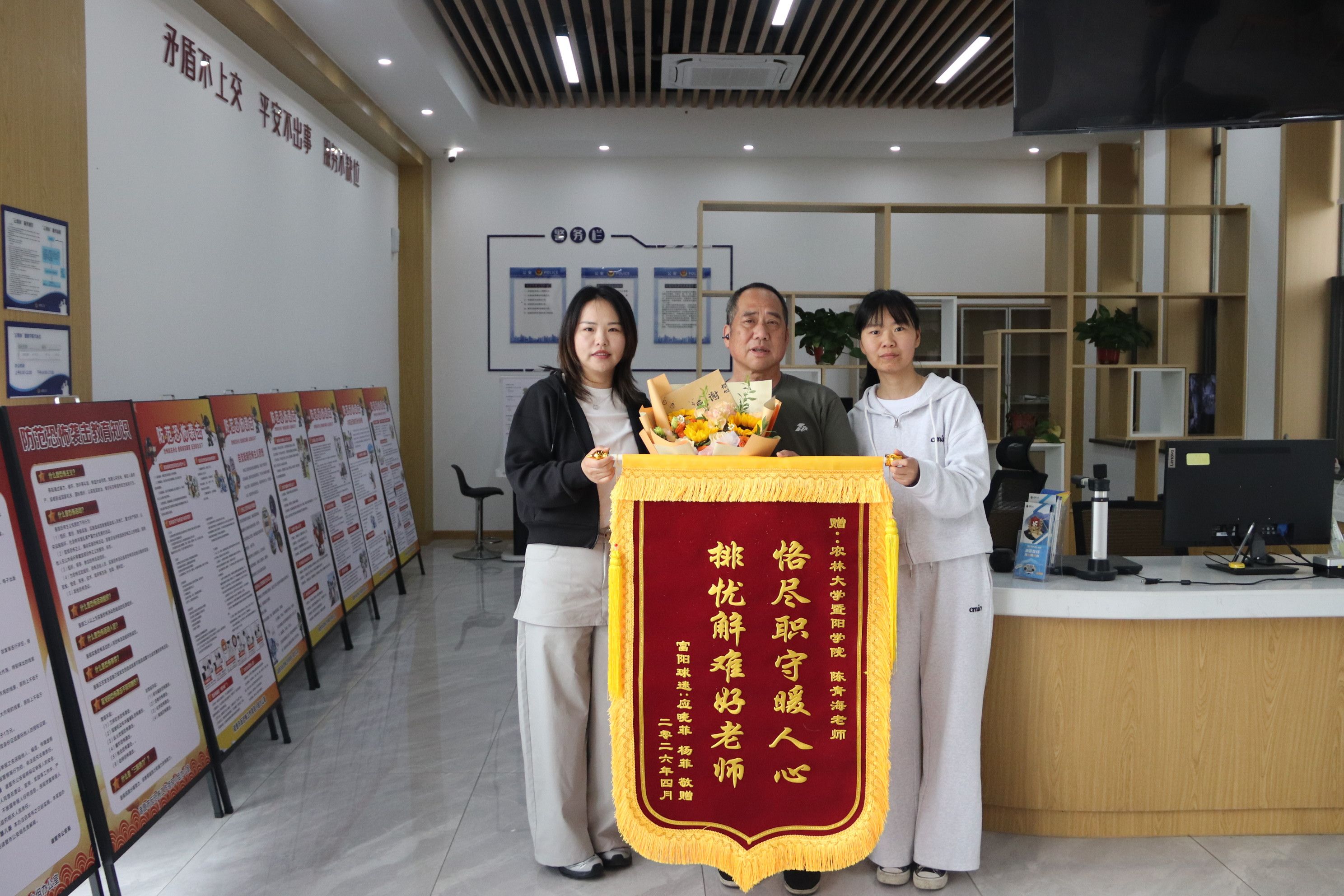 当晚比赛结束后,应女士不慎将车钥匙滑落蹲坑,正在值班的陈老师第一时间上前耐心安抚,随即俯身利用工具进行打捞,因事发空间狭窄、光线不佳,打捞难度较大,经过近一个多小时的不懈努力,最终成功将车钥匙取出。当时事发匆忙未能当面致谢,两位女士事后通过当地警方获取学院联系方式,经学院安保部对接,顺利联系上体育中心陈老师。4月17日,二人专程赶来送上锦旗与鲜花,对陈老师耐心负责、细致热心的暖心举动深表感动与感谢。面对专程前来致谢的两位女士,陈老师谦逊表示,此为自己应尽的岗位职责。