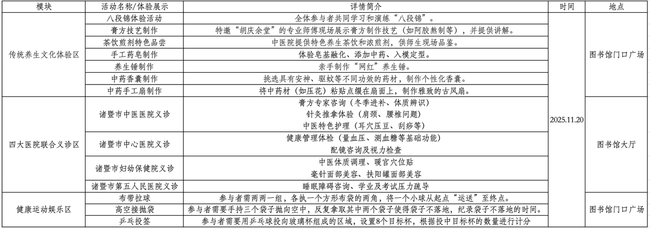 为响应“健康中国”号召,普及中华优秀传统养生文化,提升我校师生健康意识与自我保健能力,通过一系列生动、有趣的互动体验和专业的医疗咨询,让广大师生“零距离”感受中医药文化的魅力,学会科学养生,缓解学业与工作压力,特举办浙江农林大学暨阳学院第十一届健康文化节。现将有关事项通知如下: