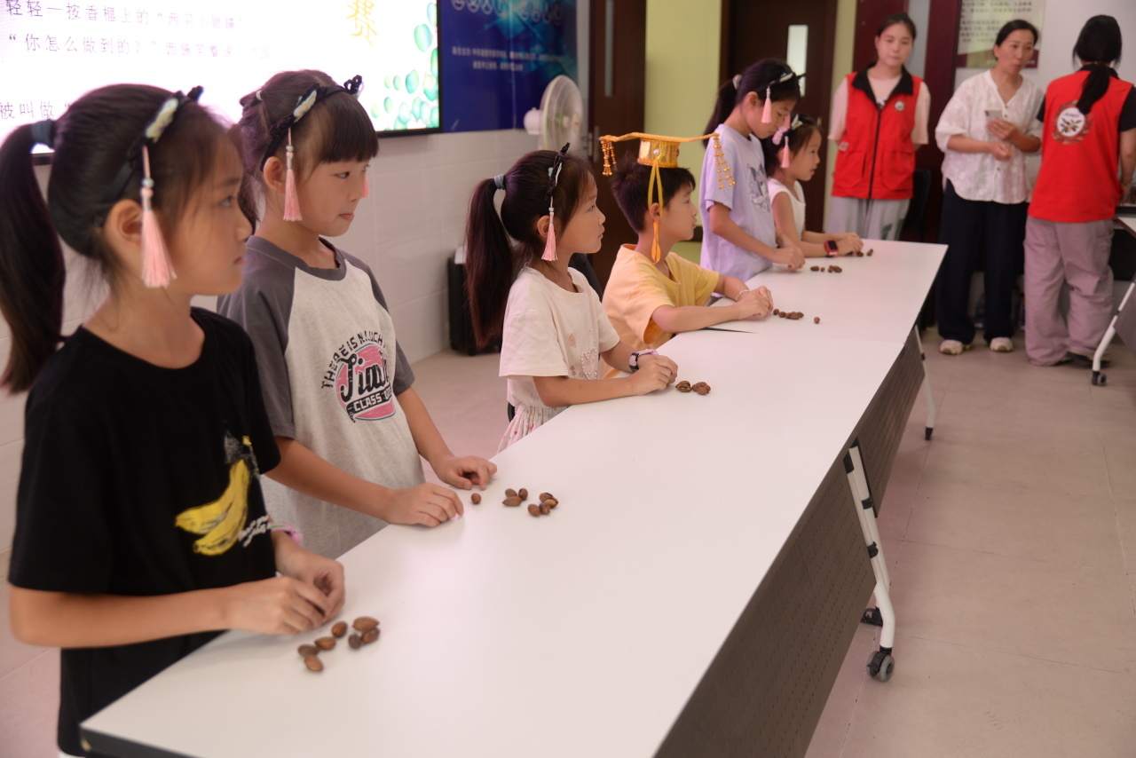 “相传春秋时期,西施在越国宫廷剥香榧时,用指甲划出一道月牙痕,这就是‘西施眼’的由来……”老师手持一颗开口香榧,将历史传说娓娓道来。在“剥香榧比赛”中,学员傅佳楠戴上金色王冠,举着剥好的香榧果得意地宣布:“众卿快看!这‘西施眼’果然名不虚传,轻轻一掰就开了!”她的语气引得全场大笑。