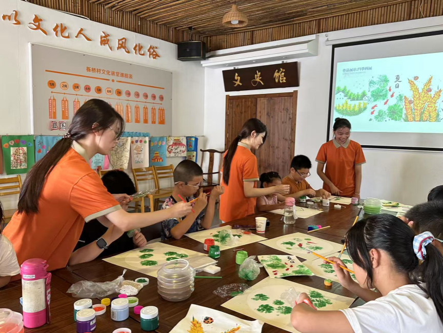 来自浙江农林大学暨阳学院的“枫艺小队”实践团通过生动有趣的视频,引领孩子们走进王冕的艺术世界。活动创新性地引入传统拓印技法,让“王冕的四季”在纸上缓缓呈现。这种新颖的绘画方式瞬间点燃了孩子们的热情,他们瞪着好奇的眼睛,不时发出阵阵惊叹。